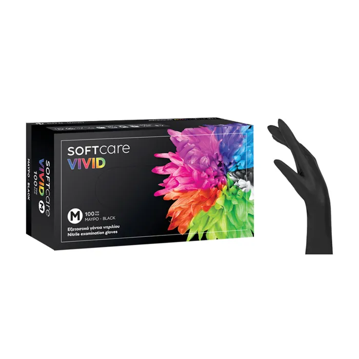 Γάντια νιτριλίου Soft Care Vivid, σε μαύρο χρώμα. Ιδανικά για την πρόληψη της διασταυρούμενης μόλυνσης μεταξύ του προσωπικού υγειονομικής περίθαλψης και των ασθενών κατά τη διάρκεια ιατρικών διαδικασιών. Χάρη στην κατασκευή τους από 100% συνθετικό καουτσούκ νιτριλίου είναι κατάλληλα για άτομα με ευαισθησία στο λάτεξ, ενώ παρέχουν εξαιρετικά σταθερό στεγνό κράτημα. Έχουν εύκολη και άριστη εφαρμογή, υψηλή ελαστικότητα και διαθέτουν φινίρισμα υφής στα δάκτυλα. Πιστοποιμένα για επαφή με τρόφιμα.